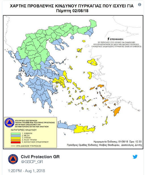 Σύμφωνα με το Χάρτη Πρόβλεψης Κινδύνου Πυρκαγιάς που εκδίδει η Γενική Γραμματεία Πολιτικής Προστασίας του Υπουργείου Εσωτερικών (www.civilprotection.gr), για αύριο Πέμπτη 2 Αυγούστου, προβλέπεται πολύ υψηλός κίνδυνος πυρκαγιάς (κατηγορία κινδύνου 4) για τις εξής περιοχές: