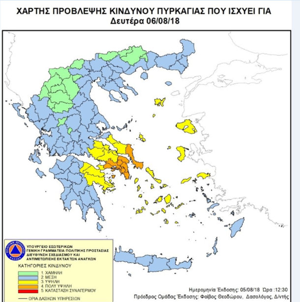 Σύμφωνα με το Χάρτη Πρόβλεψης Κινδύνου Πυρκαγιάς που εκδίδει η Γενική Γραμματεία Πολιτικής Προστασίας του Υπουργείου Εσωτερικών (www.civilprotection.gr), για σήμερα Δευτέρα 6 Αυγούστου, προβλέπεται πολύ υψηλός κίνδυνος πυρκαγιάς (κατηγορία κινδύνου 4) για τις εξής περιοχές:
