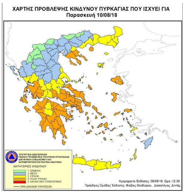 Σύμφωνα με το Χάρτη Πρόβλεψης Κινδύνου Πυρκαγιάς που εκδίδει η Γενική Γραμματεία Πολιτικής Προστασίας του Υπουργείου Εσωτερικών (www.civilprotection.gr), για την Παρασκευή 10 Αυγούστου προβλέπεται πολύ υψηλός κίνδυνος πυρκαγιάς (κατηγορία κινδύνου 4) για τις εξής περιοχές: