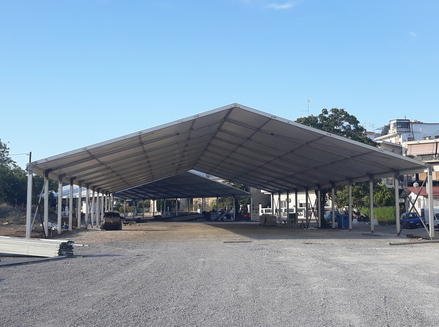 Η οροφή της εν λόγω κατασκευής είναι από P.V.C. αδιαπέραστου φωτός για την αποφυγή υψηλών θερμοκρασιών, τα πλαϊνά είναι συνδυασμός P.V.C. αδιαπέραστου φωτός και P.V.C. ημιδιαφανούς υλικού και τα παράθυρα από P.V.C. Διαφανούς υλικού. Το P.V.C. είναι άκαυστο και έχει πυρίμαχη επίστρωση και προστασία PVDF.