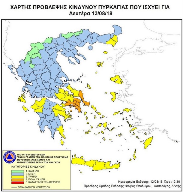 Πολύ υψηλός (κατηγορία κινδύνου 4) είναι ο κίνδυνος πυρκαγιάς για σήμερα Δευτέρα 13 Αυγούστου, στην Εύβοια και την Αττική, σύμφωνα με τον Χάρτη Πρόβλεψης Κινδύνου Πυρκαγιάς που εκδίδει η Γενική Γραμματεία Πολιτικής Προστασίας του Υπουργείου Εσωτερικών (www.civilprotection.gr).
