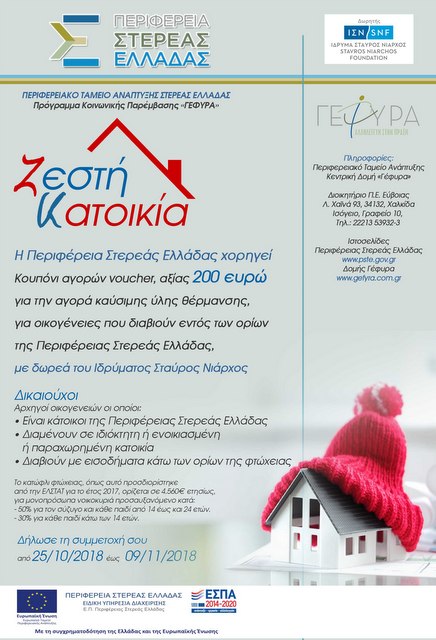 Η δράση έχει την ονομασία «Ζεστή Κατοικία» και απευθύνεται σε αρχηγούς – μέλη οικογενειών, οι οποίοι επιθυμούν να λάβουν οικονομική ενίσχυση ύψους 200 ευρώ εφάπαξ, για την αγορά καύσιμης ύλης θέρμανσης (στερεάς, υγρής ή αέριας) και διαβιούν στην Περιφέρεια Στερεάς Ελλάδας με εισοδήματα κάτω από τα όρια της φτώχειας.