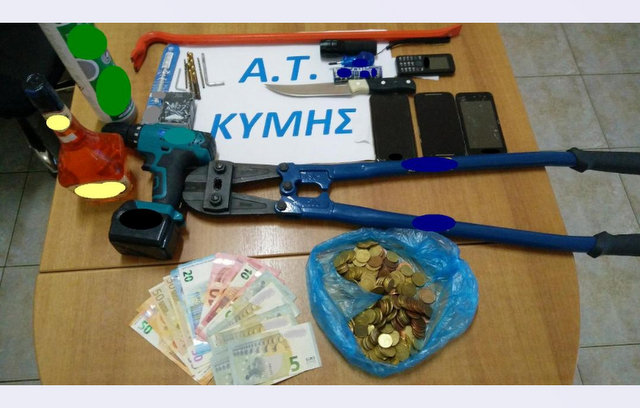Μαχαίρι με μήκος λάμας (16) εκατοστών, πληθώρα διαρρηκτικών εργαλείων (μεταλλικός κόφτης,τρυπάνια, κατσαβίδια, φανοί, κ.α.), χρηματικό ποσό (σε κέρματα) και μπουκάλι με οινοπνευματώδες ποτό, που είχαν αφαιρέσει νωρίτερα από κατάστημα mini market, το χρηματικό ποσό των 340 ευρώ και 6 κινητά τηλέφωνα.