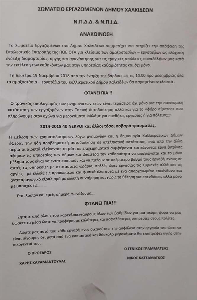 Κατάληψη στο εργοτάξιο του Δήμου Χαλκιδέων έκαναν σήμερα το πρωί της Δευτέρας 19 Νοεμβρίου οι εργαζόμενοι στο πλαίσιο των πανελλαδικών κινητοποιήσεων που προκήρυξε η ΠΟΕ ΟΤΑ για τις τραγικές απώλειες εργαζομένων στην καθαριότητα.