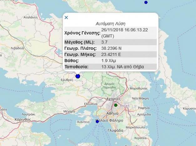 Σεισμική δόνηση, μεγέθους 3,7 βαθμών της κλίμακας Ρίχτερ, σημειώθηκε το απόγευμα της Δευτέρας 26 Νοεμβρίου. Σύμφωνα με τις πρώτες εκτιμήσεις το επίκεντρο βρίσκεται στα 13 χιλιόμετρα νοτιοανατολικά της Θήβας.