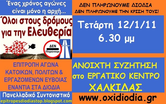 Tην Τρίτη οι επιτροπές της Ελλάδας ενάντια στα διόδια θα συνεδριάσουν στις 11 το πρωί στη Λαμία για να καθορίσουν τη περαιτέρω στάση τους. Tην Tετάρτη 12 Iανουαρίου, η Eπιτροπή της Xαλκίδας διοργανώνει ανοιχτή συζήτηση στο Eργατικό Kέντρο.